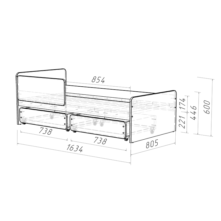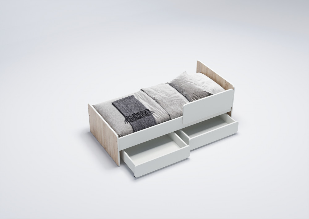 2.    Выкатные ящики: Кровать оснащена двумя выкатными вместительными ящиками, которые легко выдвигаются благодаря прямоходным колесам. Это удобное решение для хранения игрушек, одежды или постельного белья, помогая поддерживать порядок в детской комнате.