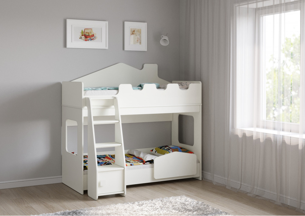 Лестница с дверью обеспечивает удобный и безопасный подъём на второй ярус. На нижнем ярусе установлен безопасный бортик, который защищает от падений во сне. Боковые стенки со световыми окнами создают уютную атмосферу и позволяют наблюдать за звёздным небом прямо с кровати.